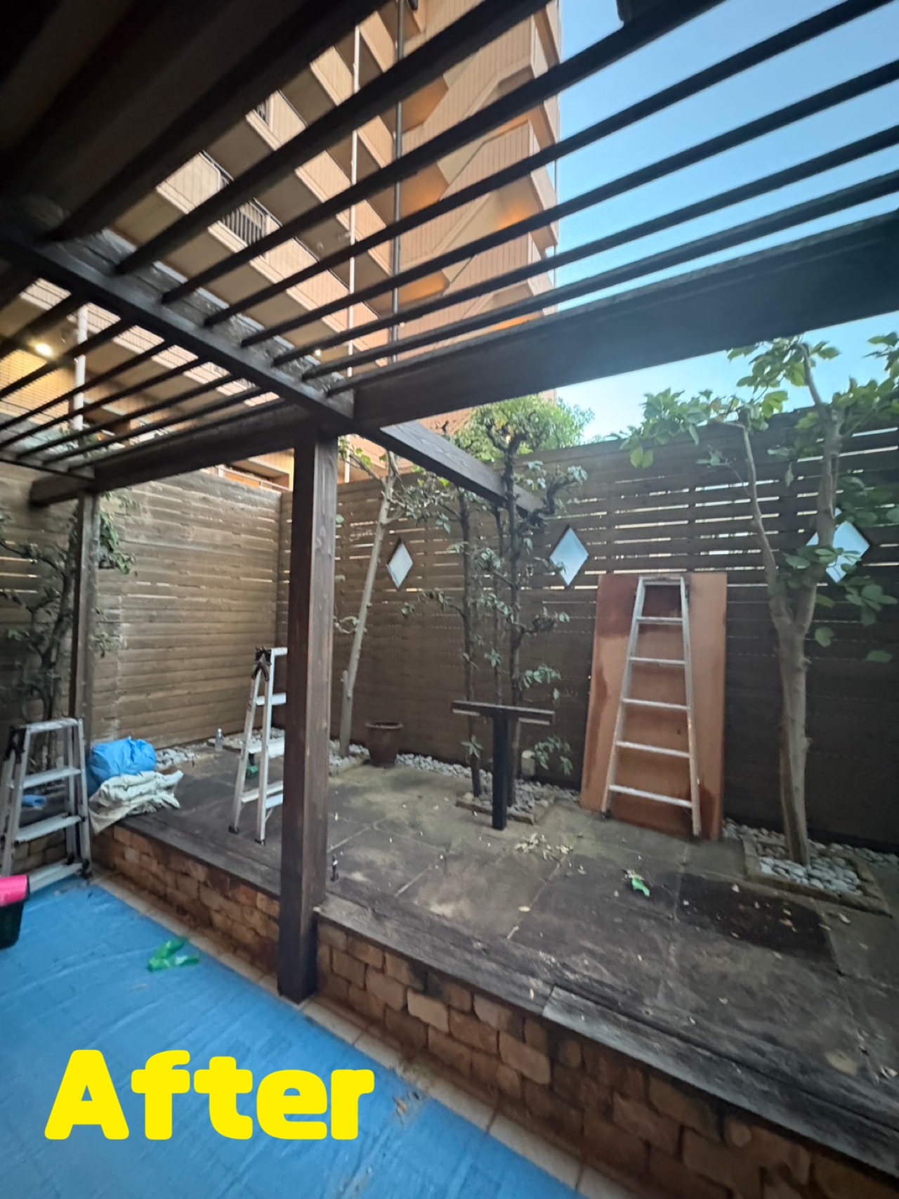 本日は、HPよりお問い合わせいただきましたお客様所有のマンションの ウッドデッキの庇補強工事と補強現状色調色塗装工事を行いました🙇